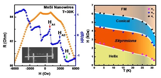 左图: 螺旋磁体MnSi纳米线中典型的磁电阻及其导数随外磁场变化的曲线。右图,MnSi纳米线的磁相图。