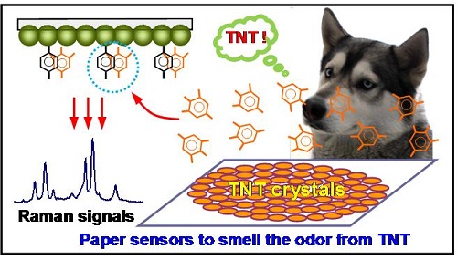 在国家自然科学基金委的支持下,中科院智能所张忠平研究员领衔的研究团队,重点针对各种材料表面以及混有痕量爆炸物物质的及时、现场检测这一挑战性难题,利用拉曼光谱独特的指纹信息和拉曼衬底易修饰拉曼活性分子的优势,研发出能嗅出爆炸物气味的拉曼传感试纸。相关研究结果近日发表在国际著名的化学期刊《分析化学》上,同时申报了国家发明专利。
