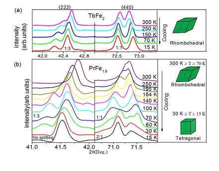 2013年,该课题组利用SHMFF X射线衍射仪开展了具有立方Laves相结构的PrFe2合金研究,首次报道了PrFe2稀土合金中的巨磁致伸缩以及自旋再取向等效应。但是,对这一体系材料的巨磁致伸缩效应的物理机制尚不清楚。本次研究在上次研究的基础上,增加了对TbFe2新样品的研究,并与PrFe2进行了对比,对这一体系的磁致伸缩的物理机制进行了理论解释。