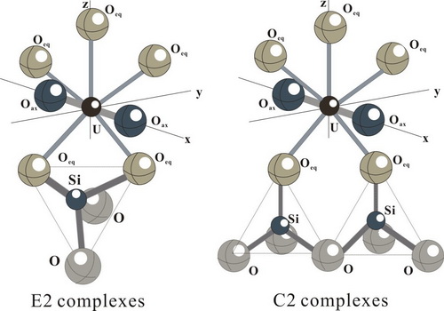在以上研究基础上,孙玉兵副研究员等研究人员采用宏观吸附、微观表征和理论模型相结合方法,从分子水平研究U(VI) 和Eu(III)在海泡石表面的作用机理。研究发现碳酸盐等环境因素明显地影响放射性核素在海泡石表面的吸附,在碳酸盐和高pH条件下易于从A类型内层络合物转变为B类型内层络合物;使用多种表面络合模型(如恒容模型,扩散模型和三层模型)和光谱学技术证实在低pH和无碳酸盐条件下,U(VI)和Eu(III)与海泡石表面形成双齿共边(E2)和双齿共角(C2)两种络合物。该研究结果为进一步研究放射性核素U(VI) 和Eu(III) 在水-矿物界面的物理化学行为作用机制奠定了基础。相关研究成果近期发表在《地球和宇宙化学》(Geochimica et Cosmochimica Acta)上。