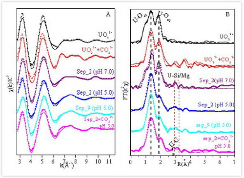 在不同pH和碳酸盐条件下U(VI)在海泡石上吸附形态EXAFS图谱