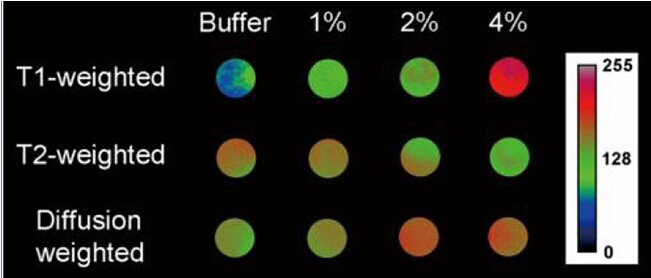 9.4T下不同浓度水凝胶样品的T1,T2和扩散加权磁共振成像