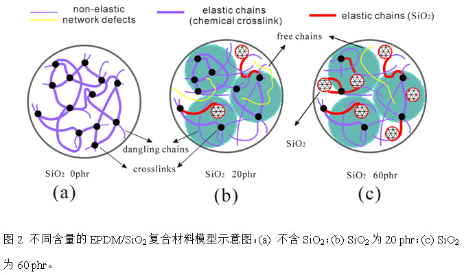橡胶的硫化交联网络是影响阻尼性能的关键因素,研发人员引入二氧化硅无机粒子到EPDM橡胶基体中,通过调控橡胶硫化网络的演化过程来控制不同温度下EPDM的链段松弛行为,最终获得了一种阻尼和力学性能同步改善的橡胶复合材料(如图1所示),尤其在高温区具有了良好的阻尼性能(T>60℃),极大拓展了阻尼温域。这主要归因于无机粒子通过抑制硫化网络降低交联密度,增加了非弹性网络的链段数量、提高了链段活动性,并随填充份数的增加呈现不同的链段松弛行为,从而改善了阻尼性能和使用温域;同时无机粒子也发挥了力学增强的效果,拉伸强度等力学性能也大幅度提升,因而该材料综合性能优异。不同含量的EPDM/SiO2复合材料的结构示意图如图2所示。