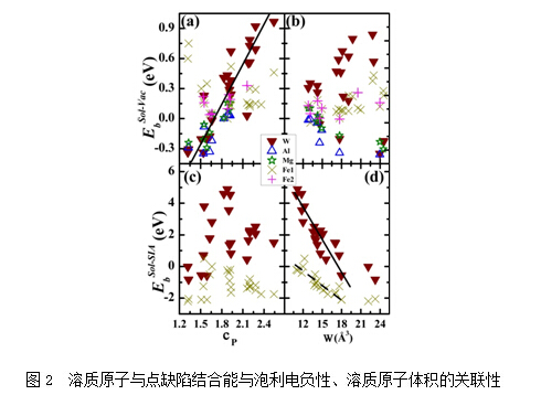 科研人员采用第一性原理方法研究了钨中过渡金属溶质原子与点缺陷的相互作用,初步建立了过渡金属原子与点缺陷相互作用数据库(图1),主要包括多种缺陷簇的稳态亚稳态缺陷构型及其能量学基本参数(形成能、结合能、作用半径等)和动力学基本参数(扩散机制、扩散激活能以及扩散系数等),该数据可以作为更高时间和空间尺度计算模拟的输入参数(如蒙特卡洛,速率理论等)。基于相关数据进一步考察溶质与点缺陷相互作用的物理控制因素,发现电子相互作用在溶质原子与空位相互作用中起主导因素,而弹性相互作用控制着溶质原子与自间隙间的相互作用,并总结出溶质与点缺陷相互作用的规律,即具有较大电负性的溶质原子倾向于空位结合,具有较小金属半径的溶质原子倾向于与自间隙结合(图2)。该规律在铝基和镁基合金中依然适用。基于溶质原子与空位和自间隙缺陷间的结合能,可推测过渡金属溶质原子能够显著缩小材料中空位和自间隙扩散速率间的差异,促进辐照诱导点缺陷的复合,提高材料的抗辐照性能,该推测解释了近期部分实验现象。最后根据计算模拟数据并结合近期实验结果,讨论了目前比较典型的合金元素Re、Os、Ta、Ti、V对辐照损伤和氢滞留的影响,对比分析表明,相比于Re,Os,Ti和V等元素,Ta更适合作为钨的合金元素,这为高性能钨合金的设计提供了新思路。