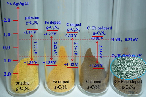 在上述研究工作的基础上,该研究团队与合肥工业大学徐进章教授及其博士研究生张守伟合作,利用简单的热转换方法在制备金属、非金属共掺杂石墨相氮化碳材料方面取得新进展。相关研究成果“Bandgap Engineering and Mechanism Study of Nonmetal and Metal Ion Codoped Carbon Nitride: C plus Fe as an Example”发表国际化学知名学术期刊《欧洲化学》上(Chemistry-A European Journal, 2014,20,9805-9812)。
