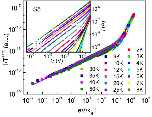 Nb2PdS5是近期发现的一种具有超高临界磁场的新型准一维超导体,其晶体由准一维金属链堆垛而成,是研究准一维超导电子结构的理想体系。课题组宁伟副研究员通过与张昌锦研究员课题组合作,通过化学剥离块体单晶纤维,得到各种尺寸的单晶纳米线,并对其超导电性进行了深入研究。研究发现,随着尺寸的逐渐减小,纳米线超导电性逐渐变弱并最终导致SIT,且出现SIT时的电阻与量子电阻没有直接关系。更为重要的是,处于绝缘态的超细纳米线,其电子输运行为随着温度和偏置电压均表现出反常的幂指数(power-law)行为,且不同温度下的电压-电流(V-I)曲线能够归一化为同一条曲线,而且在低温时出现电导饱和的特征。