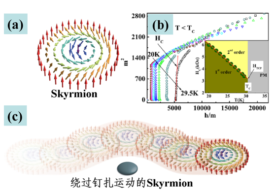图(a)Skyrmion磁构型;(b)MnSi的三重临界行为;(c)运动中的Skyrmion