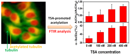 课题组运用红外光谱技术,结合免疫荧光技术的手段,检测经TSA处理后细胞中的蛋白质性质变化,同时,研究了TSA对细胞乙酰化作用的剂量效应和时间效应,探讨了TSA的作用过程和机理。研究发现,红外光谱中代表甲基与亚甲基官能团的伸缩振动强度之比可以表征TSA作用引起的组蛋白和骨架蛋白的乙酰化水平,即乙酰化水平越高,该比值也越大。另外蛋白质酰胺Ⅰ带结构的变化可以对应TSA处理后组蛋白与细胞骨架蛋白构象改变;随着细胞组蛋白和骨架蛋白的乙酰化水平提高,其二级结构α螺旋百分比也相应增加。