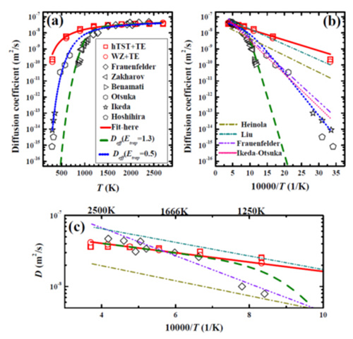 溶解度和扩散系数是理解氢同位素滞留性质的最基本的物理参数,但是到目前为止,相关研究数据十分稀少且存在较大差异。近期,固体所科研人员采用第一性原理方法研究了氢的扩散和溶解性质,并采用准简谐近似方法考察了温度对它们的影响。研究发现,温度无法改变钨中氢的最优占据位置和最优扩散路径,但是会显著影响溶解能和扩散激活能(图1)。随着温度的增加,氢的溶解能逐渐降低而扩散激活能逐渐增大。基于第一性原理计算结果,采用Sievert定律和过渡态理论计算出了300-2700K内氢的溶解度和扩散系数。其计算结果在高温范围内(大于1500K)与实验数据一致,在低温范围内与实验数据有较大差异。低温范围内的差异可以通过缺陷捕获效应进行解释(图2)。同时,科研人员发现与未进行温度修正的第一性原理计算结果相比,温度修正的第一性原理结果与实验数据符合的更好。这表明在采用第一性原理研究氢滞留性质时,需要对计算得到的数据进行温度修正。