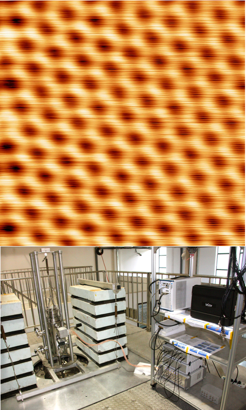 上图:10 MW水冷磁体(WM4)中获得的27T强磁场下的高定向热解石墨(HOPG)样品的原子分辨率STM图像(未作任何处理的raw data image,图像尺寸:2.4 nm × 2.4 nm)