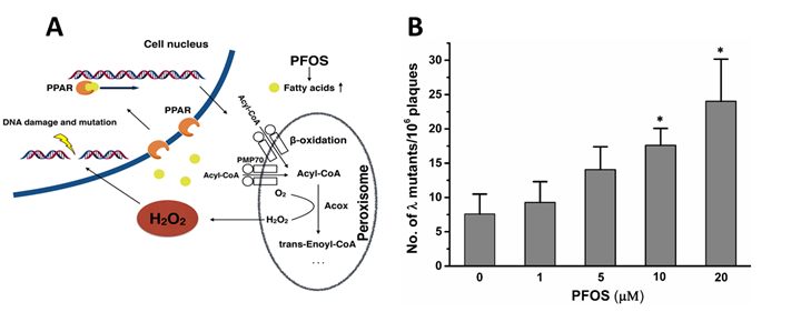 项目组成员利用gpt delta转基因鼠突变检测系统,在体外培养的小鼠胚胎成纤维细胞和小鼠肝脏器官中均发现一定浓度下的PFOS可以诱导导redBA/gam报告基因产生缺失突变。除此之外,PFOS还可以诱导小鼠胚胎成纤维细胞DNA双链断裂以及小鼠骨髓细胞产生微核。进一步机理分析发现,PFOS诱导细胞内过量脂质形成,而这些脂质通过过氧化物酶体脂肪酸β氧化分解时的副产物H2O2累积造成了DNA损伤和基因突变。研究结果揭示了PFOS诱发遗传损伤的作用靶点和应答机制,揭示过氧化物酶体及代谢产物H2O2在PFOS诱导DNA损伤中的作用,为深入探究PFOS遗传毒性和致癌性提供新的实验基础,为相关疾病的防治工作提供重要依据。