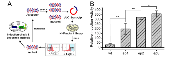 图1. 砷的细菌生物传感器进化。(A)进化流程图。(B)三轮进化后的细菌生物传感器