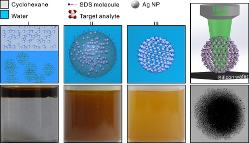 研究人员以环己烷作为提取溶剂,开发了快速分离和富集真实人体尿样中苯丙胺类物质的方法,整个过程5分钟内即可完成,毒品的萃取率均大于80%,富集浓度能够提高8倍以上。而且,利用水包油乳浊液法组装环己烷相中的单分散银纳米粒子,制备了水相中的三维银溶胶超结构,在三维空间上构筑了大量的SERS热点,将热点拓展到z轴维度,充分利用了激发激光聚焦体积的三维空间,实现待测分子的高灵敏检测,突破了传统上x-y笛卡尔平面对SERS活性区域的局限。研究结果显示,三维 SERS 热点溶胶超结构可以实现水相或有机相中待测分子的高灵敏和高重现性的识别和检测,以及多种组分的多通道检测。此外,利用数学识别算法可以快速、准确地识别人体尿样中不同毒品的拉曼信号,实现了毒品分子ppb量级水平的多通道检测。该研究成果不仅提供了一中尿样毒品的快速分离富集与检测方法,而且对推广毒品的现场快速检测具有非常重要的意义。