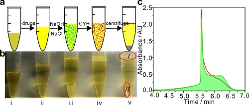 图2、(a、b)人真实尿样中毒品的快速分离富集及(c)超高效液相色谱法检验谱图。