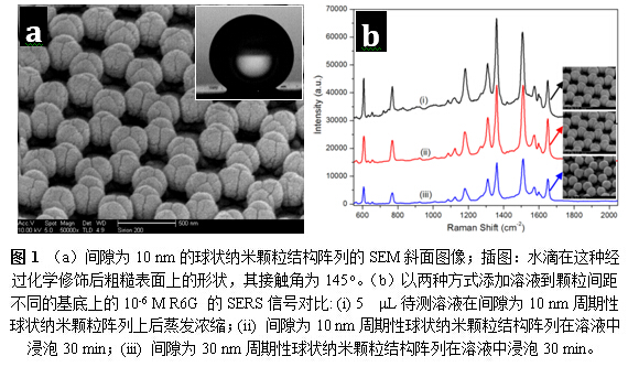 在此基础上,该研究小组进一步发展了一种简便、廉价的方法,即单层胶体晶体模板-诱导前驱液填充以及后续溅射沉积,制备颗粒间隙可调的周期性球状纳米颗粒结构阵列。相比于溅射沉积前的有序网络状结构阵列,该阵列表现出良好的SERS均一性能和灵敏度。由于受到电磁耦合作用,颗粒间隙为10 nm的结构阵列表现出更高的SERS增强效应。经过化学改性后,该结构阵列表面具有良好的疏水性能,如图1所示,以此作为SERS活性基底,可使水溶性探测分子溶液在其表面快速蒸发,引起探测分子局域浓缩,大大缩短了有机分子的检测过程。能够在短时间内、使用少量检测溶液的情况下,实现待检测分子的快速检测。疏水性SERS基底的构筑有力解决了微体积、超低浓度的有机溶液难以用SERS检测的难题(Advanced Materials Interfaces, 2015, 2, 1500031)。