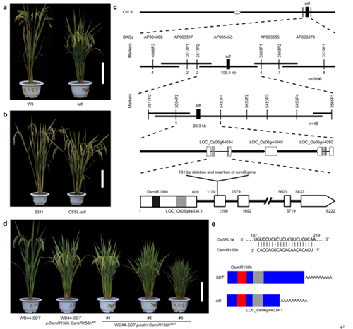 研究围绕离子束辐照获得的水稻显性半矮秆突变体开展,该突变体不仅农艺性状优良,最主要特性是能够直接降低杂交组合F1的株高,提高抗倒伏能力。课题组利用图位克隆技术,分离和解析了sdt基因的分子机制。Sdt突变体是一个功能获得型突变,编码mircoRNA156的一个前体基因OsmiR156h,在OsmiR156h基因中插入了一段131bp的线粒体片段,进而影响mRNA长度,增加了OsmiR156的成熟体表达水平,通过作用于Spl基因家族来调控分蘖、株高以及产量,并且表现出剂量依赖效应。通过聚合sdt基因与“绿色革命”基因水稻sd1,能够使水稻产量在目前超级稻的基础上提高约20%。这项研究表明,通过人工改造OsmiR156的多聚核苷酸状态是提高水稻产量潜力的一种新策略,对于培育水稻高产抗倒伏新品种、促进水稻产量进一步提升具有重要的指导意义。