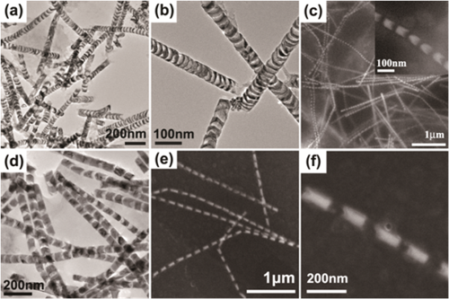 此项工作基于超晶格纳米线,结合电化学腐蚀手段实现了金属颗粒链的制备。首先在AAO模板中电沉积Ni/Cu超晶格纳米线,然后将其浸泡于15wt%NaOH溶液中约50min,即可制备出了一维Ni颗粒链。通过调节Ni/Cu纳米线的周期长度,实现了对颗粒链的几何参数包括颗粒尺寸、长径比、颗粒间距的调控(图1),最小的颗粒尺寸和间距可分别达到6nm和15nm。对腐蚀机理进行了详细的分析,对比实验表明,Ni/Cu在NaOH溶液中发生的反应为电化学腐蚀,腐蚀类型为接触式电化学吸氧腐蚀。当两种活泼性不同的金属相接触,并被放置于一个中性或碱性环境中时,容易发生氧被还原的吸氧腐蚀,这一反应发生的必要条件是金属的电极电位低于氧的还原电位。在本实验中,沿Ni/Cu纳米线轴向方向,Cu与Ni在NaOH溶液中形成多个接触型原电池,Cu在碱性溶液中电极电位是0.219V,低于氧的还原电位0.41V。因此,Cu作为阳极失去电子被腐蚀,生成大部分可溶性产物。O2在阴极得到电子被还原,Ni作为阴极不参与反应,只是起到传输电子的作用。