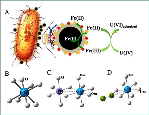 U(VI)在Fe0和Bacillus subtilis上的吸附机理图(A)及存在的化学形态(B、C和D)