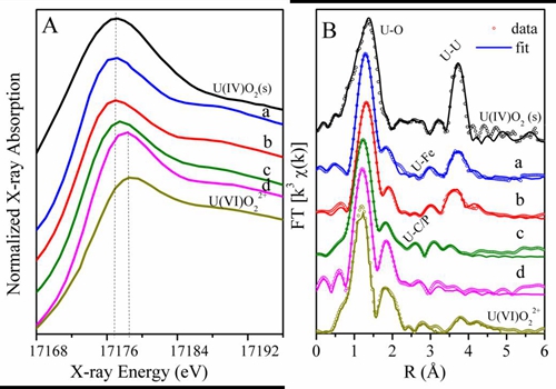 该课题组人员利用先进的X射线吸收精细结构光谱(XAFS)研究放射性元素U(VI)在纳米材料(功能化氧化石墨烯,纳米零价铁)和环境微生物(枯草杆菌,Bacillus subtilis)等不同的环境介质中吸附规律,探讨了U(VI)在不同水-固界面上的吸附形态和微观机理。研究结果发现在pH > 4.5条件下枯草杆菌提高放射性U(VI)的吸附速率,然后显著地抑制了U(VI)在纳米零价铁的还原过程,主要是由于U(VI)以内层络合物形式吸附在枯草杆菌表面上。该研究结果为进一步研究放射性元素U(VI) 在水-纳米材料-微生物界面的物理化学行为及其作用机制奠定了坚实基础,为准确预测U(VI)在不同环境介质中的迁移转化行为和生态污染效应提供了有力的理论依据。