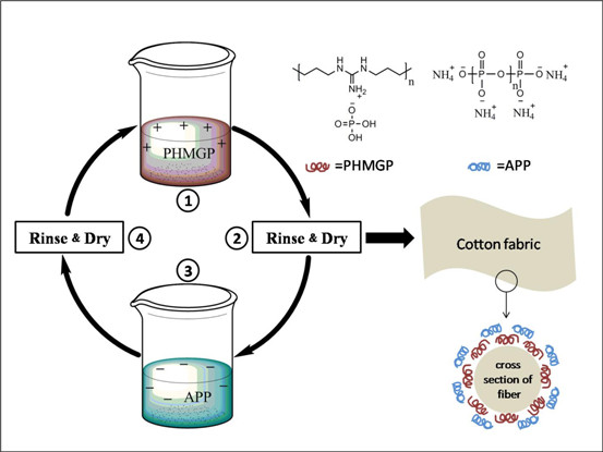 层层自组装技术是近年来研究的热点,通过分别将带有正负电荷的水性溶液在织物等衬底上交替多次沉积可形成纳微米功能涂层,该技术具有工艺简单易行、性能易于调控、环保无污染、适用面广等特点。研究人员选择了一种带有正电荷且具有阻燃特征元素的抗菌剂水溶液,并与另一种带有负电荷的阻燃剂协同,在棉织物上构筑了一层功能涂层,一方面两种阻燃剂构成了完整的膨胀型阻燃体系,具有快速自熄、高效防火的特点;另一方面抗菌剂发挥了优良的抗菌效果,对大肠杆菌和金黄色葡萄球菌等不同类型的细菌都具有很好的抑制作用。