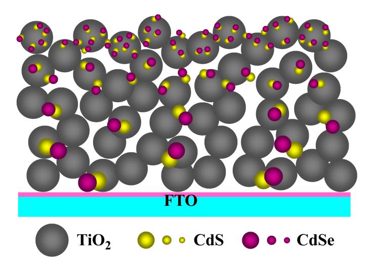 图1. TiO2纳米颗粒薄膜光阳极中CdS/CdSe量子点的分布模型