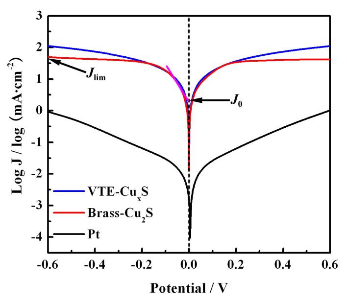 图2. Pt、Brass-Cu2S和VTE-CuxS三种对电极对称结构电池的Tafel曲线