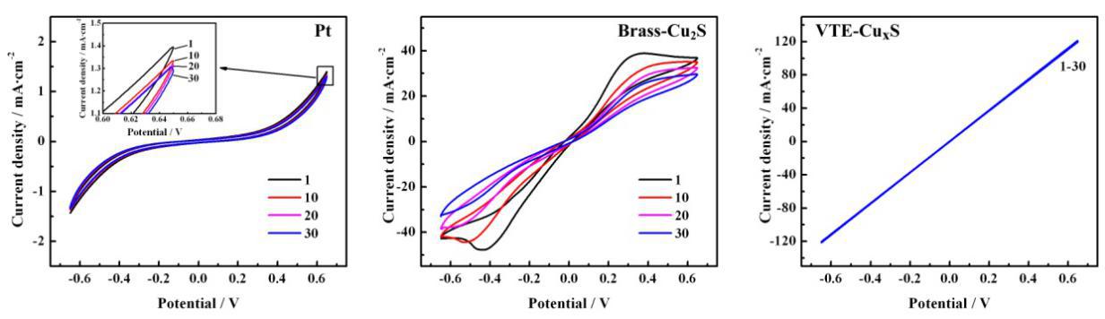 图3. Pt、Brass-Cu2S和VTE-CuxS三种对电极的循环伏安曲线