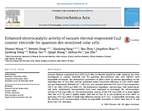 安光所激光技术中心功能薄膜材料研究室王时茂等研究人员在量子点敏化太阳电池(QDSCs)光阳极中量子点的分布和CuxS(硫化铜)对电极研究方面取得新进展。
