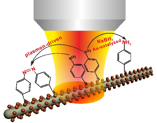 科研人员设计的这种单个一维的SERS反应器,由于颗粒和线的等离子体耦合以及小尺寸的金纳米颗粒的具有催化效应等特点,既可以实现对等离子体驱动的化学反应监测,又可以监测金颗粒催化的反应。更重要的是,由于银纳米的长度在微米量级,可以在拉曼光学显微镜下进行清晰定位,这使得催化体系可以限定在一个固定的区域,减少周围基底的干扰。