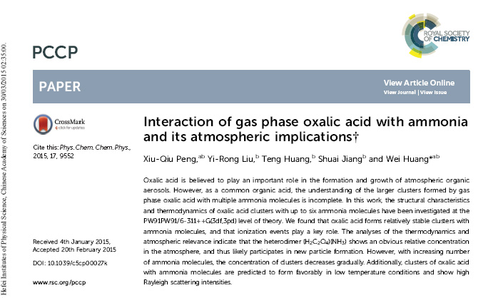 近期,安光所基础科学研究中心、中科大环光学院黄伟研究员课题组对乙二酸与氨的相互作用形成的团簇(H2C2O4)(NH3)n(n=1–6)及其对大气的影响进行了深入的理论研究,研究结果已发表在英国皇家化学会出版的Physical Chemistry Chemical Physics(2015, 17, 9552)上。