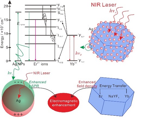 上转换材料中能量转移以及由表面等离子体共振引起的电磁场增强示意图