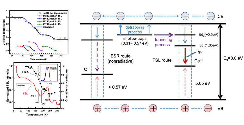 LuAG:Ce,Mg陶瓷闪烁体中电子和空穴陷阱相互作用关系示意图