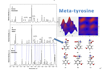 对于生物分子振动光谱理论计算,课题组比较多种理论模型的计算,得出SMD溶剂模型和色散修正对氨基酸分子的结构参数计算和光谱计算的精度有明显的提升。以间位-酪氨酸(m-Tyr)为例,系统研究了其拉曼和红外光谱,并借助同位素拉曼光谱实验和理论计算数据对比解析它的振动模式。相关成果发表在国际光谱学专业期刊《Spectrochimica Acta Part A: Molecular and Biomolecular Spectroscopy》(2015, 151, 111–123)。