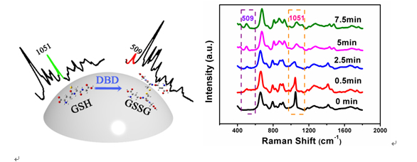 在以上工作基础上,课题组利用SERS技术对一种生物体内普遍存在的生物分子谷胱甘肽(glutathione)在电离辐射条件下的氧化还原反应进行定量分析和研究。研究中,用环糊精做还原剂和稳定剂制备了SERS活性好、背景干扰小且形状大小均一的银纳米颗粒,由此对微量还原型谷胱甘肽(GSH)和氧化型谷胱甘肽(GSSG)进行了SERS检测和分析,发现可以通过509cm-1(S-S)与1051cm-1(C-N)这两个拉曼谱相对强度比值作为由GSH向GSSG转变的度量指标。该项工作不仅解决了SERS技术对微量生物分子反应体系所涉及混合物的定量分析,而且提出一种新的考量生物辐射损伤的检测方法,为下一步在活体细胞中实现对生物应激辐射氧化胁迫反应或辐射损伤进行快速、无损、定量评估打下基础。相关成果发表在RSC Advances ( 2015, 5, 57847–57852)。