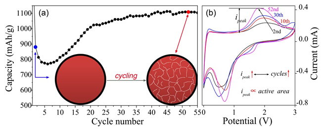 (a) γ-Fe2O3@C/MWNT电极的循环性能及微结构演化示意图;(b) γ-Fe2O3@C/MWNT电极在不同循环次数后的CV曲线。