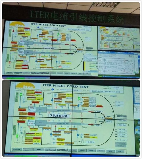继2015年1月等离子体所完成国际热核聚变实验堆计划(ITER)中CC 10kA高温超导电流引线原型件研制和测试后,6月26日—7月13日,由一室承担的ITER大型超导馈线系统采购包再传捷报:TF 68kA高温超导电流引线原型件成功通过全电流68kA稳态和75kA过流运行。