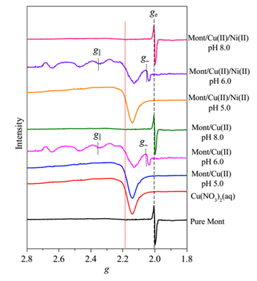 基于上述背景,苏州大学放射医学及交叉学科研究院环境化学研究团队结合静态批实验、表面络合模型拟合,X射线衍射技术、借助稳态强磁场实验装置的EPR谱和上海光源的XAS谱测试分析,深入研究了二价重金属离子Cu(II)和Ni(II)在天然矿物蒙脱石上的竞争吸附行为和对应的微观作用机制。