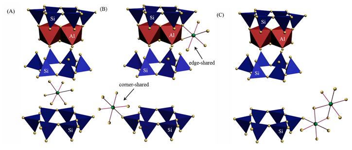 图2. 重金属离子Cu(II)和Ni(II)在蒙脱石上的吸附形态. (A) 外层络合物;(B) 内层络合物;(C) 多核表面络合物