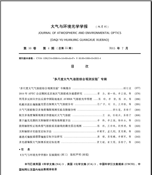 7月28日,2015年第4期《大气环境光学学报》出版发行“多尺度大气气溶胶综合观测实验专辑”,专辑汇集了大气气溶胶天、空、地三维一体综合观测实验中的地基和航空观测技术研究,包括仪器定标、技术原理、数据处理以及不同尺度大气气溶胶观测结果分析等方面的研究成果,供广大科研人员参考。