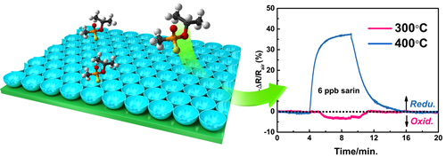 众所周知,沙林毒气是一种剧毒神经毒剂,可以通过呼吸道或皮肤黏膜侵入人体,杀伤力极强,其易挥发,靠自然蒸发就可以达到战斗浓度,一旦散发出来,可以使数公里范围内的人中毒,甚至死亡。当前,如何快速简便检测沙林等神经毒气是人们亟待解决的问题。基于上述MEMS基高性能气敏器件,科研人员与解放军防化学院相关研究组合作,探索了该器件在痕量高毒性生化战剂(如沙林)检测方面的应用。科研人员通过对敏感材料表面进行改性,使得沙林气体在检测过程中发生了还原-氧化性转变,如图2所示。在400摄氏度,沙林表现了本征的还原性气体特性,而在300摄氏度,其却展现了反常的氧化性气体特性。通过比较其他气体(乙醇、丙酮及沙林模拟机DMMP)响应,只有沙林展现出了这种双性气体(Janus gas)特性,成功的实现了对沙林的选择性检测,有效区分了沙林和其模拟剂DMMP。该MEMS基器件可检测到低达6 ppb的沙林毒气,是目前采用金属氧化物半导体型气敏传感器文献报道可检测到的最低浓度。这项工作,为将电阻型薄膜气体传感器的应用领域拓展至某些特殊领域提供了近期可实现性。这些特殊领域包括,要求快速响应、高灵敏、低功耗等的领域,如公共安全领域的高毒性气体的痕量监测及智能传感网等。相关结果近期发表在英国皇家化学会的《化学通讯》上(Chem. Commun. 2105, 51, 8193-8196,论文链接地址:http://dx.doi.org/10.1039/C5CC01798J)。