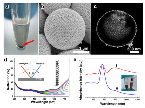 图a:黑金(Plasmonic Colloidosomes)的实物照片。图b:SEM图。图c:Scanning-TEM图;图d:从不同角度的‘黑金’反射图谱,测试衬底采用白板聚四氟乙烯(PTFE)。图e:“黑金”(i)和金纳米颗粒(ii)溶胶的吸收图谱。