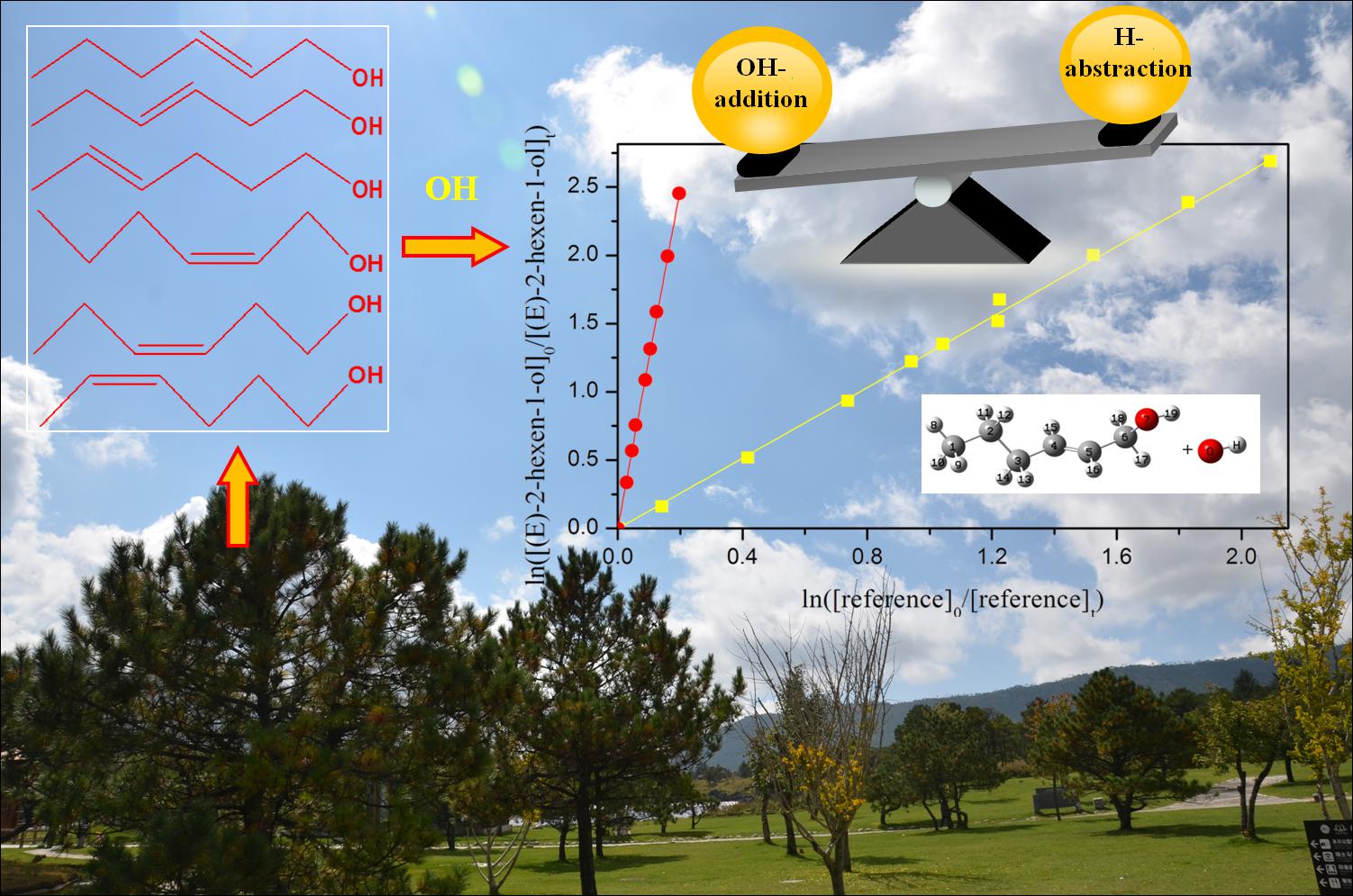 C6不饱和醇,以叶醇为代表,是大气中一类非常重要的生物源挥发性有机化合物(BVOCs)。它们的大气氧化反应可以导致臭氧和二次有机气溶胶的生成,从而对大气环境产生影响。近些年来,外界环境和气候条件的变化,比如臭氧浓度升高、全球变暖等,进一步刺激这一类物质大量排放,使得这种影响变得越来越重要。与OH自由基的反应是不饱和化合物在大气中的主要氧化反应,一般有两个反应途径:OH-双键加成反应和夺氢反应。通常研究过程中因为夺氢反应所占比重很小,该反应途径经常被忽略。文献调研发现,C6不饱和醇与OH的大气化学反应数据较少,已有的理论和实验结果存在很大差别,造成以这些理论数据为基础的模式模型结果存在更大的不确定性。对夺氢反应通道的忽略可能是导致这些偏差的重要原因。