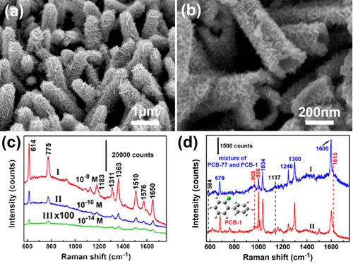 图2. (a)银纳米片组装的纳米管阵列的扫描电镜(SEM)照片;图(b)折断的纳米管的SEM照片;图(c)不同浓度R6G的SERS光谱;图(d) 20μM多氯联苯-77 (PCB-77)和10μM多氯联苯-1 (PCB-1)的混合物溶液(曲线I) 以及30μM的 PCB-1溶液(曲线II)的SERS光谱。