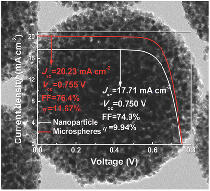 TiO2亚微米球形貌图及对应太阳电池电流-电压曲线 |