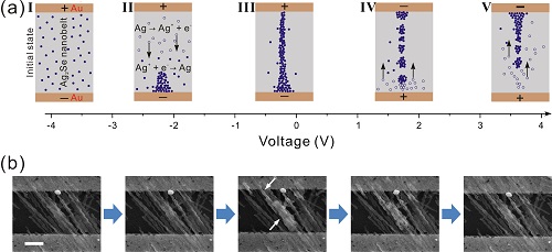 图1. (a)硒化银纳米带电阻转换行为机制,(b)电极间纳米带中银迁移及导线形成过程原位SEM表征
