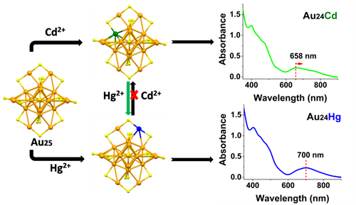 研究人员以具有核-内层-外层结构的负一价Au25纳米团簇(简写为[Au25]-,图1)为底物,考察了其与四种常见的二价活泼金属离子(Zn2+、Co2+、Ni2+,Cd2+)的反应,发现这四种金属离子都能与[Au25]-发生“反伽伐尼还原”反应:Zn2+、Co2+、Ni2+能引起[Au25]-价态的升高,而Cd2+与众不同,除了氧化[Au25]-外,还能与[Au25]-作用生成一种新的产物。经质谱鉴定,这种新的产物为镉掺入的合金团簇,单晶X-射线衍射揭示Cd掺入Au25的内层,与具有相似电子结构的Hg掺入位置截然不同(J. Am. Chem. Soc. 2015, 137, 9511)。理论计算给予了Cd掺杂到内层位点的进一步证实,并且揭示Cd的掺入能明显改变[Au25]-的电子结构,引起[Au25]-的吸收光谱发生显著变化(见图2)。研究人员还发现,Au24Cd与Hg2+反应能迅速转变为Au24Hg;而其逆过程Au24Hg向Au24Cd的转化没有成功(图2)。结合实验与理论计算,研究人员对该转化机理进行了初步的解释,有关研究还在深入中。