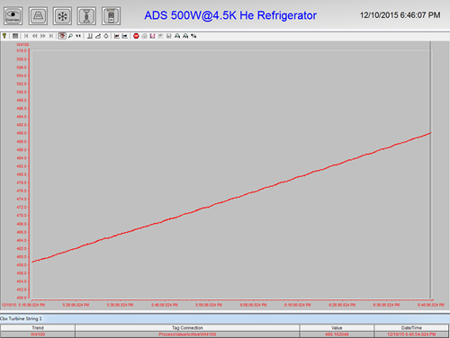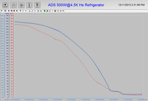 500W/4.5K氦制冷机用于先导专项ADS嬗变系统超导腔及超导磁体的测试。等离子体所低温工程与技术研究室于2014年初启动项目,历时近两年的时间自主设计并研制了氦气除油系统、真空冷箱、自动控制系统并完成系统集成。经过多轮80K调试和系统改进,最终顺利完成了4.5K低温调试并生产出液氦。