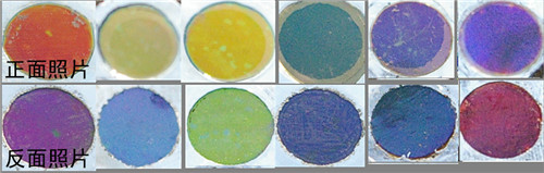图3 异质结构多孔氧化铝光子晶体正反照片,对应的上、下两照片为同一样品