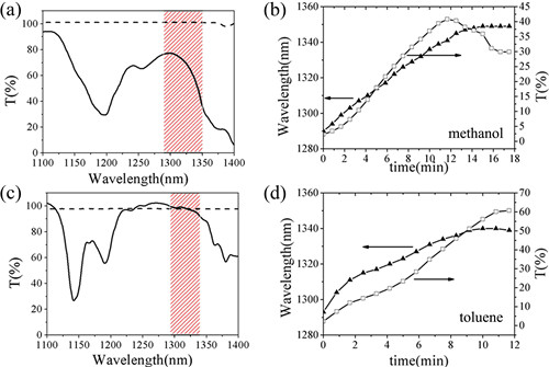 多孔氧化铝光子晶体是通过阳极氧化铝片得到的,在一定的阳极氧化电压作用下,氧化铝孔道在生长方向上直孔和二分叉孔周期性生长,形成直孔层和二分叉孔层的周期结构,因此多孔氧化铝光子晶体是一种纳米尺度周期性的多孔结构。虽然多种结构都能实现光子带隙,但是宽度窄的光子带隙依然很难实现,对于多孔氧化铝光子晶体而言,由于酸性电解液的作用,带隙宽度也通常在几十纳米到几百纳米之间。他们采用补偿电压模式,克服了制备过程中出现的前后结构不均一的困难,制备出具有窄带隙的光子晶体,带隙宽度最小可达几纳米。由于多孔氧化铝光子晶体的这种全介质多孔性结构,他们利用这种光子晶体成功地实现了一种简单的依靠折射率改变的传感器(Mater. Lett. 110,2013, 156-159; J. Mater. Chem. C 1, 2013, 1659-1664; J. Mater. Chem. C 1, 2013, 5285-5291; Chinese J. Chem. Phys. 27, 2014, 121-124)。这种传感方式不同于电信号传感器,光子晶体吸附被探测物时,改变了光子晶体每层的有效介电常数,从而会引起光子带隙位置的改变,通过跟踪光子带隙位置的改变就能得到环境中被探测物量的变化,如果带隙是在可见光范围,整个探测方式就可以完全脱离电信号。相比于电信号探测而言,光信号的探测更加安全可靠,这有望应用于易燃易爆及电致变性等材料的原位探测,使其成为一种具有前景的传感材料。