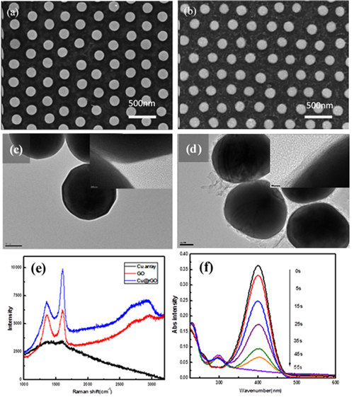 图(e)从下至上的曲线分别为铜纳米颗粒阵列、氧化石墨烯以及石墨烯包覆铜纳米颗粒阵列的拉曼图;